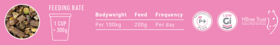 - Oudere paarden en pony’s die niet aan het werk zijn, maar die goed op gewicht blijven met kleinere hoeveelheden voer.